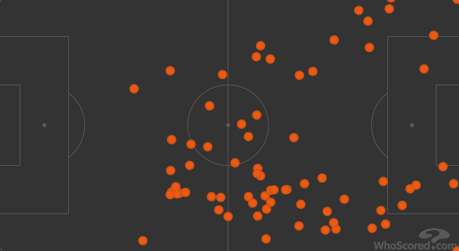 It’s the lack of the extra playmaker that impedes the side when the two number 6’s play together, since you have to withdraw a creator and have the lone string puller play more as a number ten. This in turn causes the team to produce less dribbles from this area of the field, less key passes, and less balls into the opposition defensive 3rd.