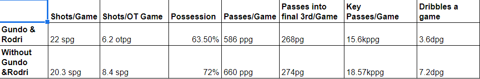 Perhaps what’s more of a damning stat to the hopes of this partnership being effective is the lack of incisive movement from the midfield area. The Gundo/Rodri midfield produces 3.6 less dribbles from the midfield per game which is a pretty big drop off, and they also play 6 less passes into the opposition 3rd.