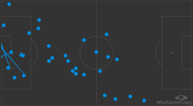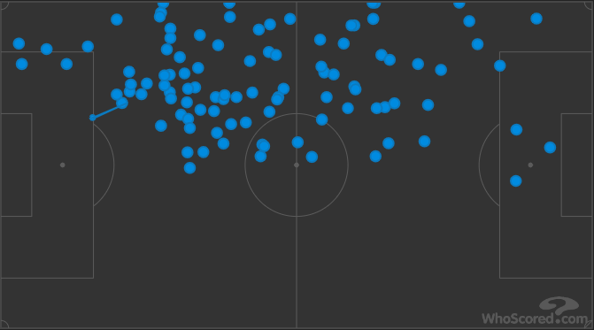 This touch map really illustrates the central positions Walker was yet again asked to occupy for this City side. He was tucked in very much to the central areas, as he took the title of ‘Inverted Full Back’ to the absolute extreme.