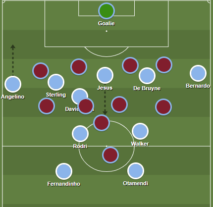And just for good measure, here’s an in game depiction of the structure I’ve discussed in this post, with all the aforementioned elements; the double pivot formed with Walker & Rodri, the two 8’s playing advanced, Sterling tucked in as an inside winger occupying the Burnley full back, and Angelino making the most of the available space.
