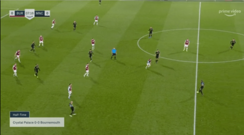 City of course lined up in the 4-3-3, with a couple of changes in personnel. Angelino came in for Benjamin Mendy who I can’t say is in the right shape to play Saturday to Tuesday right now (or even on Saturday for that matter). Then there was the reintroduction of Nicolas Otamendi, perhaps better suited to the bar fight rough and tumble Burnley side than John Stones. In midfield Rodri was the pivot, brought in for Ilkay Gundogan, and Bernardo Silva came in