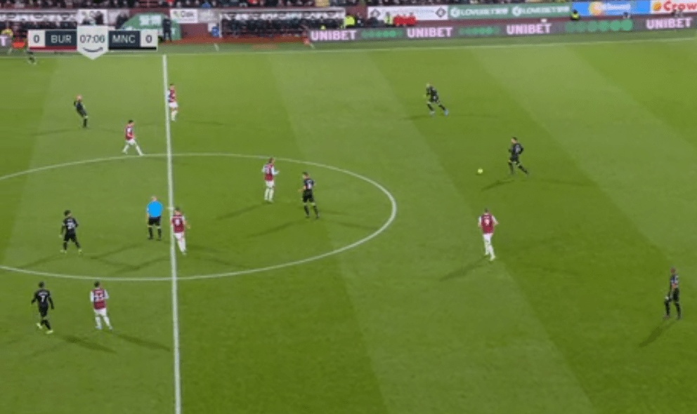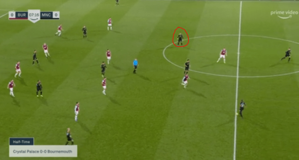 This was important since first and foremost it gave us the coveted numerical superiority to play from our centre backs (+right back in this scenario), past Burnley’s press and into the midfield. It also had ramifications higher up the pitch, and tied into the overall goal of achieving numerical superiority in the central areas of the pitch. Rodri’s movement here is very significant, since it occupies the other Burnley striker and prevents the centre backs from being pressed by 2 players, and allows City to have more men in the middle.
