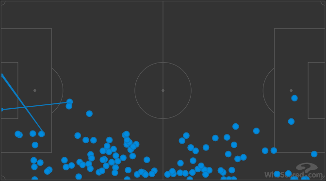This is the touch map of the two number 8’s, and as daft as it sounds I really can’t think of anything that tactically elaborate to say that wouldn’t be old news to anyone that’s watched us. We have two really good football players playing in this role, and as they should they get tons of touches, and act as our creative sparks.
